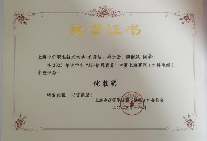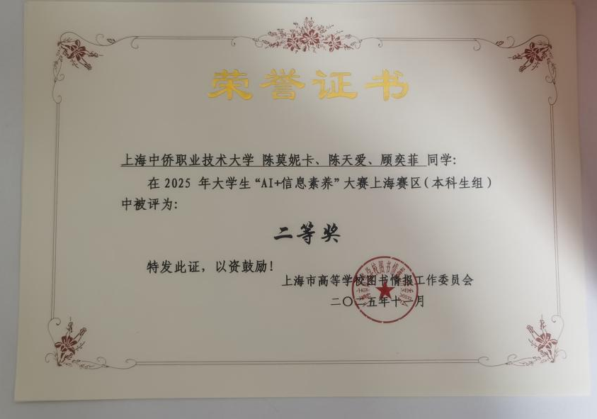 近日,2025 年大学生信息素养大赛上海赛区选拔赛圆满落幕。在全市 25 所高校的激烈角逐中,上海中侨职业技术大学两支参赛队伍凭借扎实的专业功底、默契的团队协作与新颖的实践表达脱颖而出,分别斩获决赛二等奖与优胜奖,充分彰显了学校学子卓越的信息素养与综合实力!
