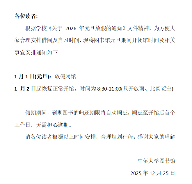 图书馆 2026 年元旦放假及开闭馆安排通知