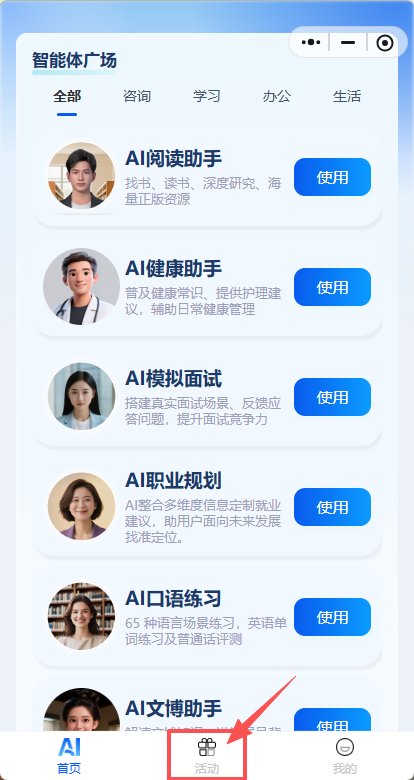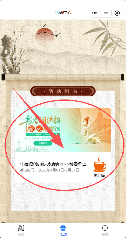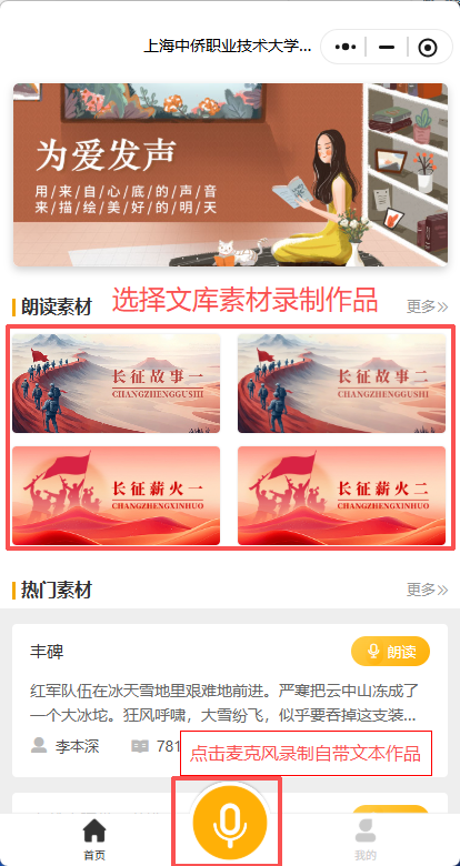 第二步:点击底部“活动”登录微信账号(本人手机号码),进入后再点击诵读大赛专题页面,根据系统提示进行作品录制并报名;