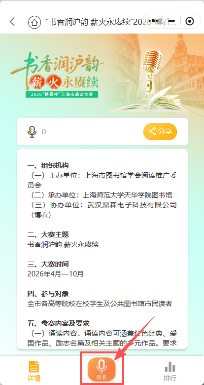 4.参赛规范:严禁他人代录,作品未在市级其他诵读类活动中获奖,违者取消参赛与推荐资格。