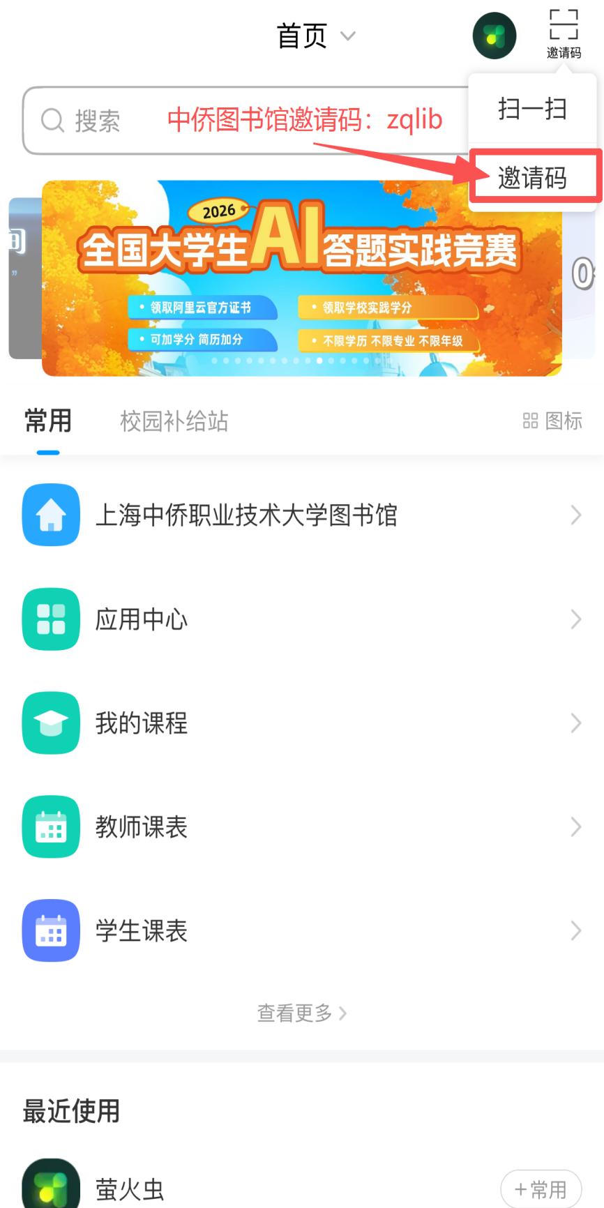 第二步:选择“手机验证码登录”方式完成注册/登录,在 APP 首页右上角输入本校邀请码(如图2),进入我校图书馆专属页面,点击“AI 馆员”应用入口;