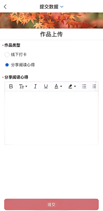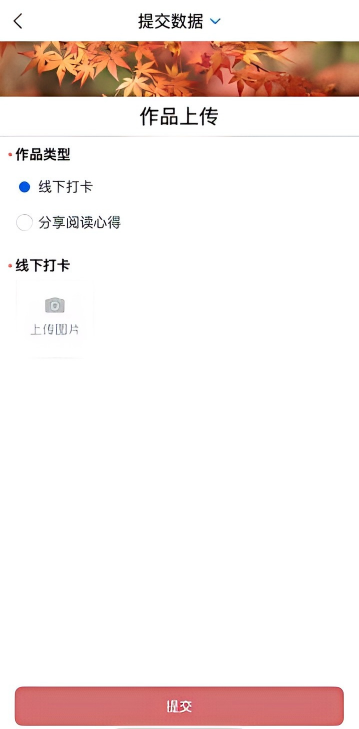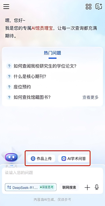 第三步:进入AI馆员页面后,按要求点击对应模块完成线上任务,系统自动累计积分;线下打卡、分享阅读心得需通过页面内“作品上传”入口,选择对应作品类型提交相关材料,审核通过后获取积分。